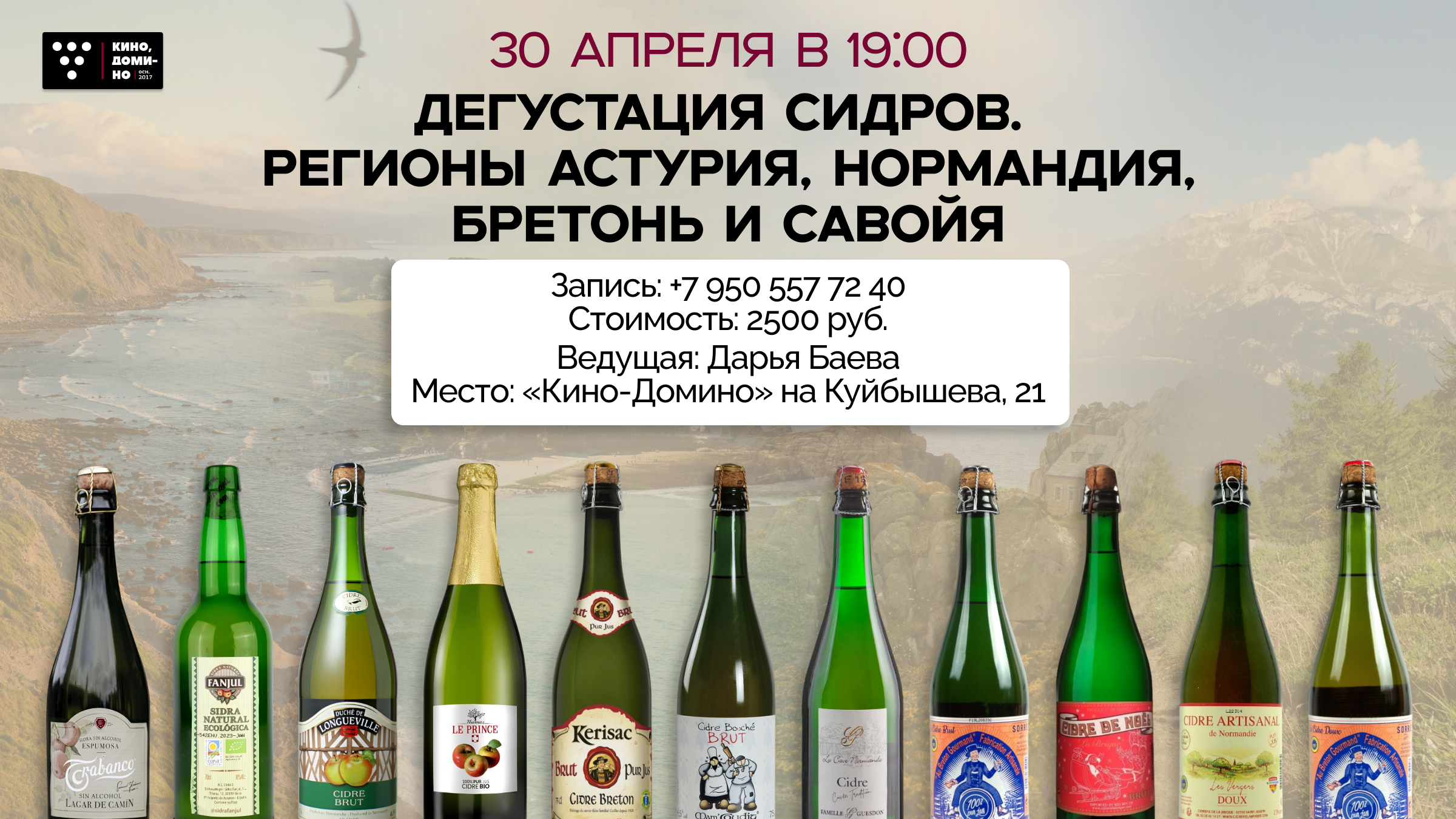 За один вечер побываем в Астурии, Нормандии, Бретани и Савойи! От сухого и бодрящего астурийского сидра до мягких бретонских сидров с приятной кислинкой и необычного фруктового сидра Савойи. Идеальный повод открыть новые вкусы и влюбиться в сидр заново.