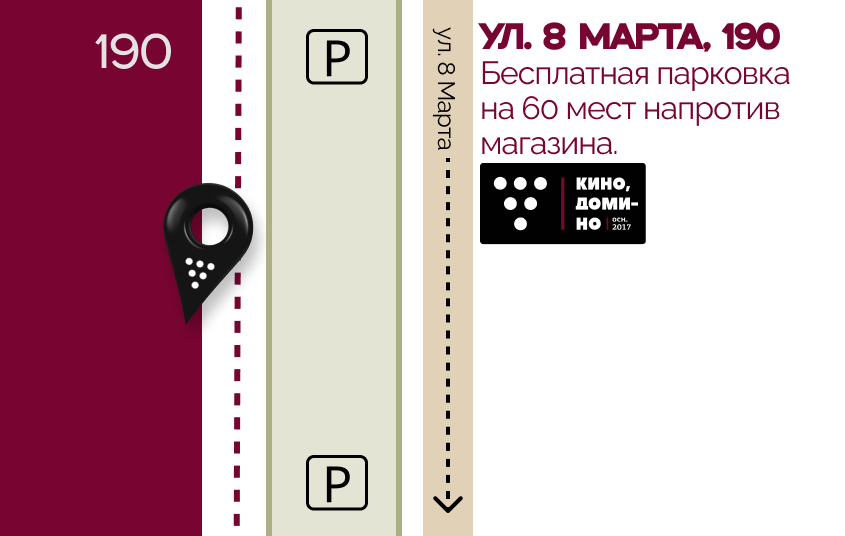 Информация о парковке: бесплатная парковка на 60 мест напротив магазина.